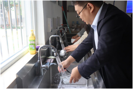 经测算,原普通水龙头出水流量约为0.2升每秒,每分钟出水量约12公斤,加装节水器后出水流量约为0.046升每秒,每分钟出水量约2.76公斤左右。水龙头节水原理是在出水口加装一层钢圈,能把水柱打散成水雾状流出,虽然出水量减少但不影响日常使用体验。经初步测算,仅职工三餐洗碗用水一项,可实现每天节水约近1立方米,节水效果明显。
