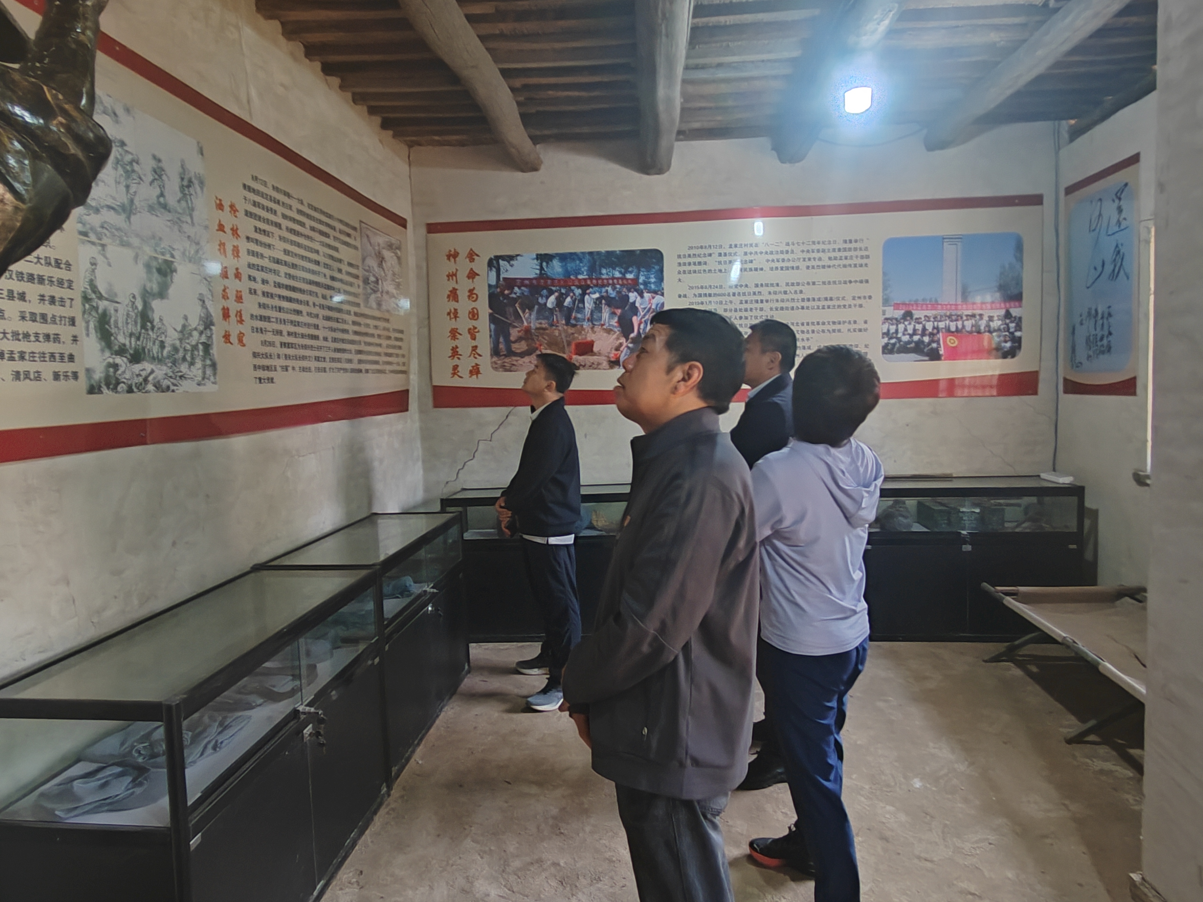 在庄严肃穆的抗日英烈纪念碑前,全体党员整齐肃立,怀着崇敬之心向革命先烈敬献花篮,深深鞠躬,深切缅怀为民族解放事业英勇献身的革命先烈。随后,大家瞻仰了朱仰兴烈士雕像,并走进纪念馆学习。通过一幅幅珍贵历史图片和生动的讲解,党员们深入了解了朱仰兴烈士在定县地区组织群众开展反“扫荡”斗争的英雄壮举。听闻他在孟家庄战斗中为掩护乡亲安全转移而壮烈牺牲的事迹,在场人员无不动容,深刻感受到革命先辈以血肉之躯铸就民族解放钢铁长城的不朽精神。